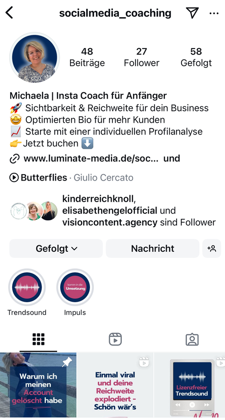 Ich bin Michaela, Instagram-Coach für Selbständige und Anfänger. In den letzten zwei Jahren habe ich über 50 Profile analysiert und optimiert. Ich weiß, wie frustrierend es ist, wenn der eigene Steckbrief einfach nicht wirkt – und genau deshalb habe ich den Bio-Check entwickelt. Er gibt dir die Grundlage, endlich sichtbar zu werden und Kunden zu gewinnen.